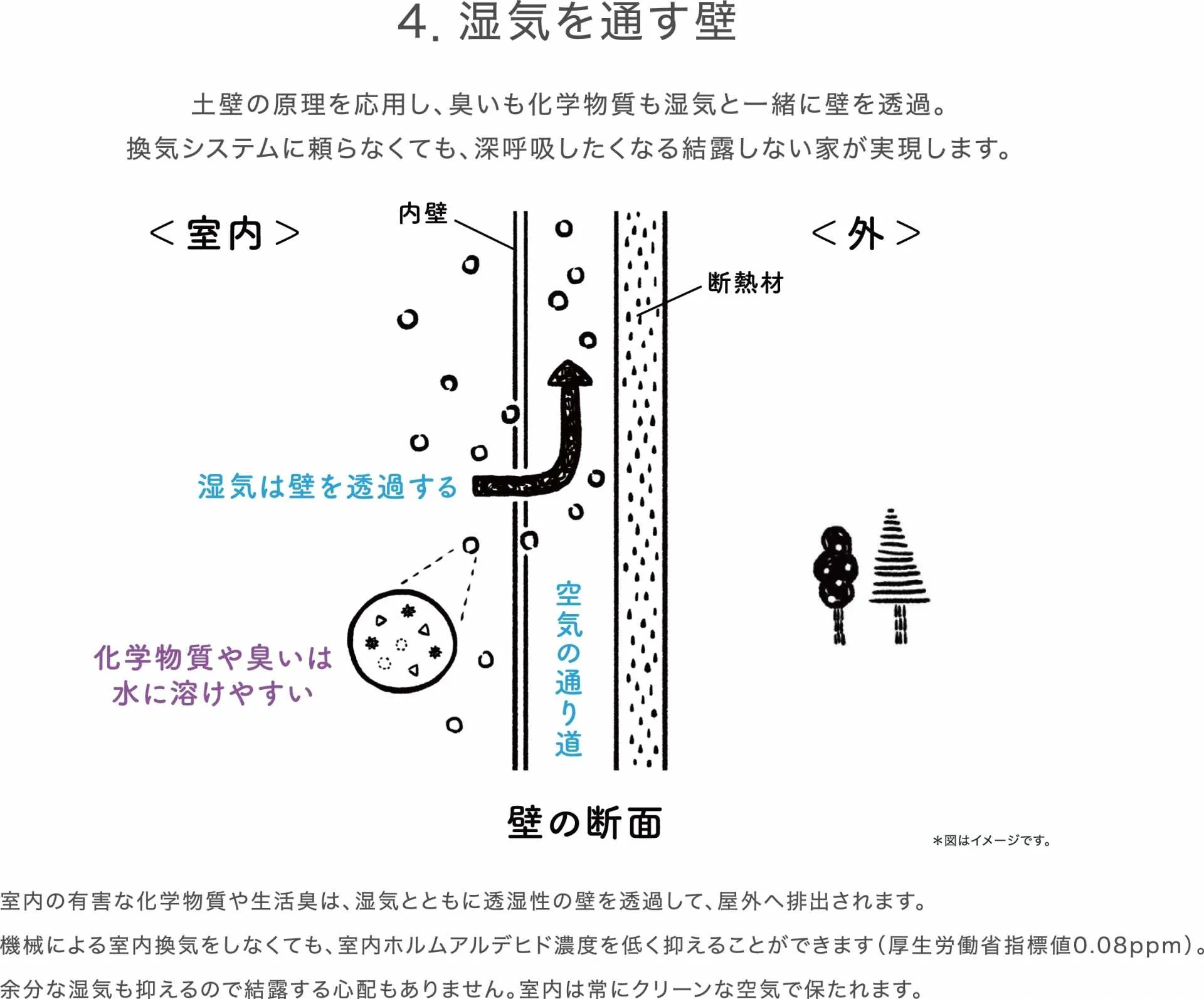 WB工法による新築住宅は、以下の特長により、シックハウス症候群の心配のない住まいを実現します: