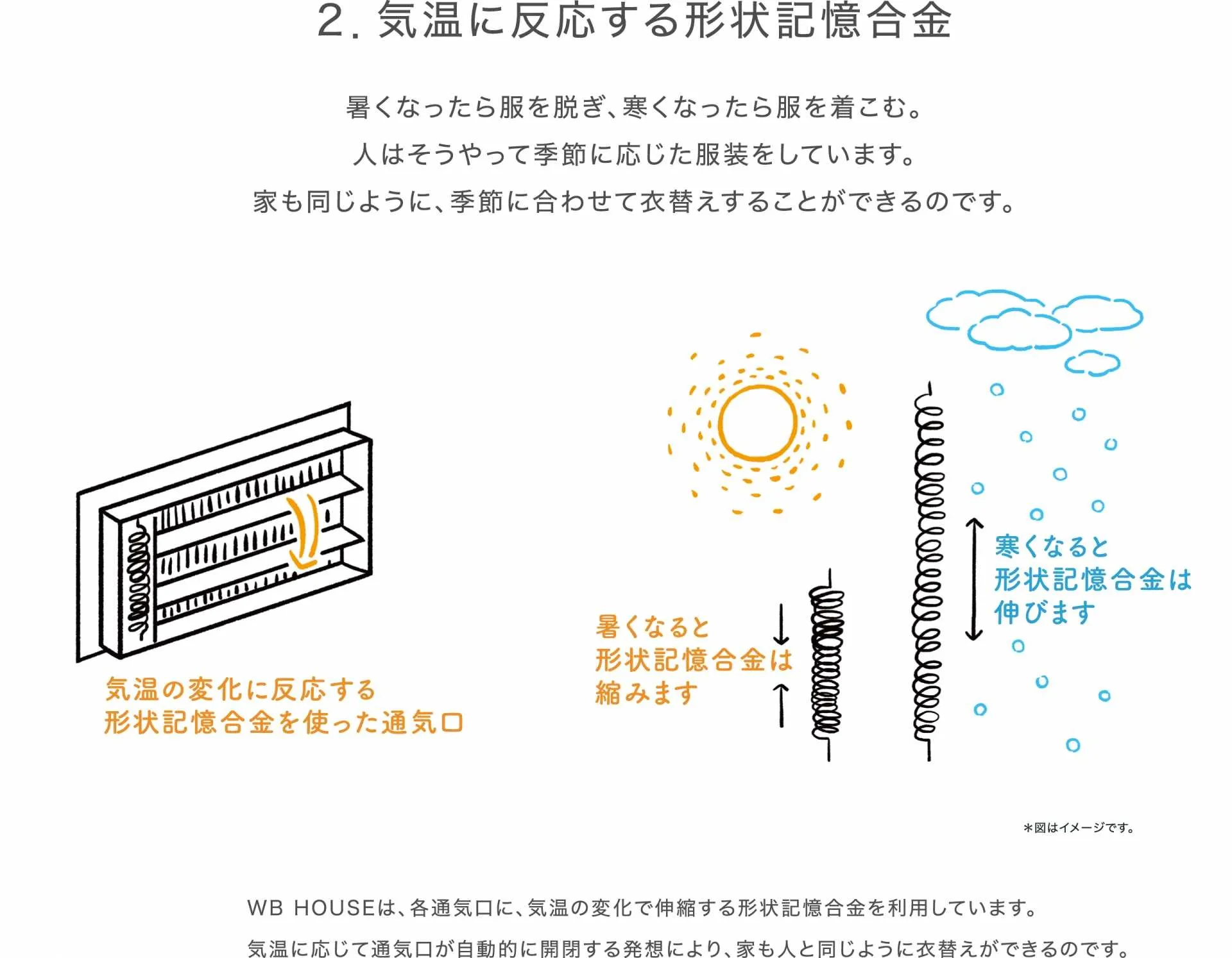 WB工法のもうひとつの大きな特徴が、気温によって自動で開閉する「形状記憶合金バネ付きの通気口」です。夏になると気温の上昇に反応して通気口が開き、屋根裏や壁の中にたまった熱気を外へ逃がします。逆に冬には気温の低下で通気口が閉じ、暖かい空気を外に逃がさないよう工夫されています。